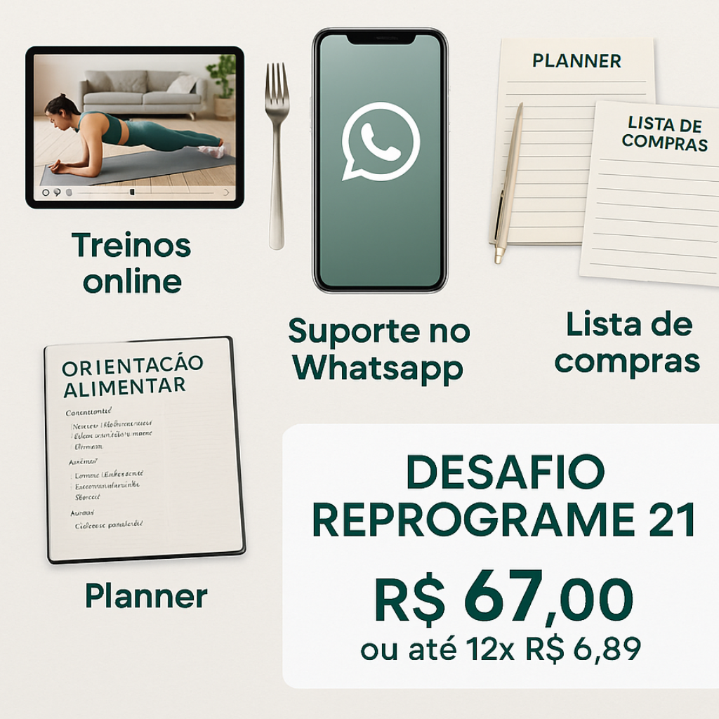 É um programa de 21 dias que combina treinos metabólicos rápidos, orientação anti-inflamatória e suporte diário para reprogramar o metabolismo e fazer o corpo voltar a queimar gordura 24h por dia — especialmente para mulheres que sentem que o corpo desacelerou após os 35/40 anos.
