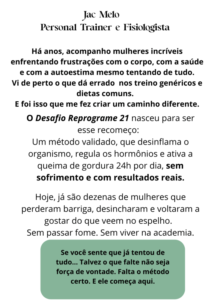 Todos os Direitos Reservados. Copyright © Jac Melo – Reprograme 21 – 2025 Este site não é afiliado ao Facebook, Instagram ou Meta. Depois que você sair dessas plataformas, a responsabilidade não é deles é totalmente do nosso site. Os resultados podem variar de pessoa para pessoa. A perda de peso e redução de medidas dependem de fatores individuais como rotina, alimentação e constância. Nosso compromisso é entregar metodologia, orientação e acompanhamento para que você tenha o suporte necessário para atingir seus resultados.